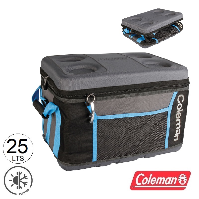 Conservadora flexible con diseño plegable y bolsillo frontal de red, para un almacenamiento extra. Correa de hombro ajustable para un cómodo transporte. Tapa con 4 posavasos moldeados y destapador integrado en el cierre. Revestimiento anti-bacteriano que resiste la formación de olores, humedad y hongos entre usos. Capacidad: 25 lt.